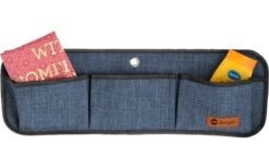 Aus eloxiertem Alu-Rundrohr, einer zentralen, rollbaren Alu-Arbeitsplatte, 2 seitlichen Ablagen aus beschichteter Hartfaserplatte und mit 3 Gewebeschränken mit Reisverschluss und inneren Ablagefächern. Mit abwischbarer Schutzfolie unter der Alu-Rollplatte.